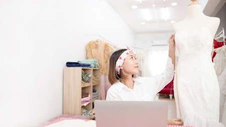 Small business owners are working in happiness in the tailor shop. A teenage Asian woman works as a clothing designer, she is measuring and designing a wedding dress smilingly.