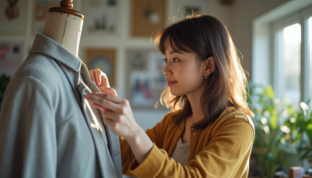 A woman dressmaker sews a black corduroy jacket on a mannequin in her atelier, close up