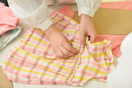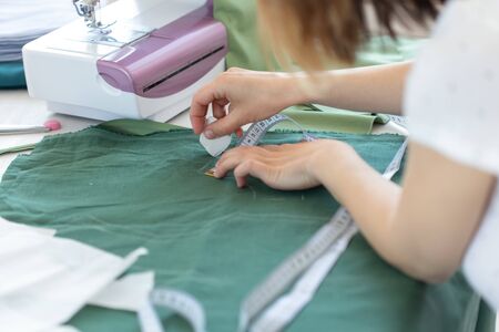 Hands of a young girl designer makes marks for a new sew product sitting at the table next to the sewing machine. Concept of creative business and design.