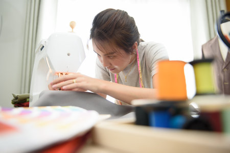 Asian young woman dressmaker working with a sewing machine in her cutting studio at home. Very shallow focusing point at her eye while looking to presser-foot on sewing machine