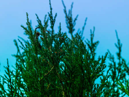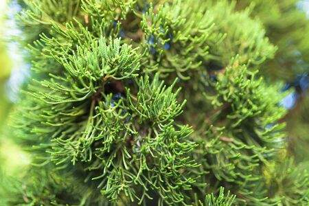 Furry juniper tree brunches background. Close - up of branches with fruits, selective focus.