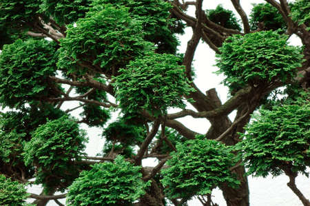 Coniferous trees in the form of a sculpture. Landscaping in the city. Japan