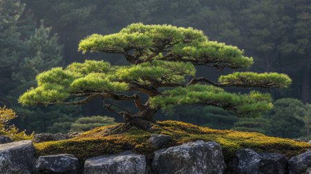 Majestic Japanese pine in zen garden, early light and crisp shadows adding depth to the peaceful landscape