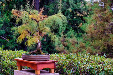 A stunning bonsai tree sits on a wooden stand in a garden. Its vibrant green and yellow leaves contrast with the surrounding lush foliage, creating a peaceful atmosphere.