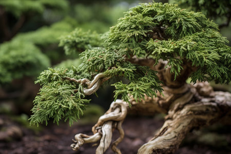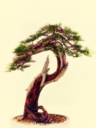 A bonsai tree with a windswept style, its branches angled as if shaped by the wind, on display in a zen garden.