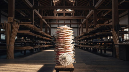 A talented artisan focuses on painting intricate designs on traditional paper umbrellas in a warm and inviting workshop filled with artistic tools and decor elements.