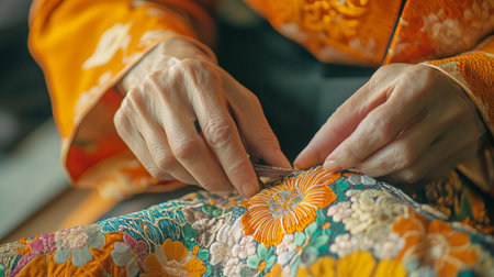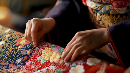 A Japanese woman in Kimono costume is touching a rich, embroidery kimono fabric with beautiful pattern in souvenir shop. handwork concept AI-Generated