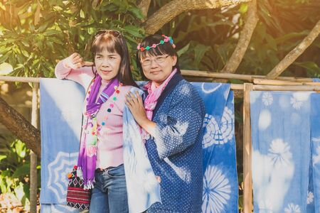 LAMPHUN THAILAND - DECEMBER 12 : Unidentified Thai female tourists learn to make tie-dye clothes on December12,2019 at Karen village in Lamphun, Thailand
