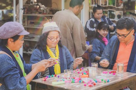 LAMPHUN THAILAND - DECEMBER 12 : Unidentified Thai female tourists learn to make a necklace from a yarn ball on December12,2019 at Karen village in Lamphun, Thailand