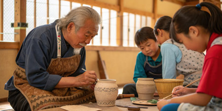 Senior craftsman painting pottery with children in workshop