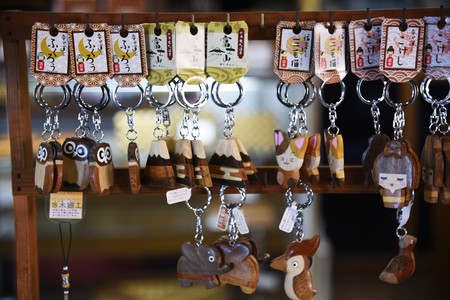 Traditional Japanese tourist souvenirs and gifts from Kyoto, Kansai, Japan, with daruma figures, kitsune fox, tengu mask, refrigerator magnets, toys figurines, key ring keychain, in a local vendor gift shop