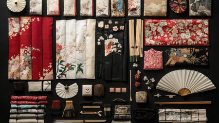 A captivating display of traditional Japanese textiles and accessories, showcasing vibrant colors, intricate patterns, and cultural heritage meticulously arranged on a black background.
