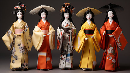 3D illustration of Japanese geisha dolls in a studio background.