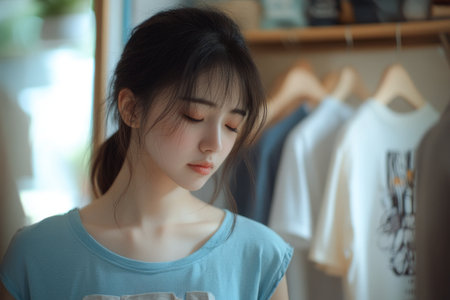 A young girl stands quietly in a softly lit room, casually leaning against a white wall. Her long black hair frames her face as she glances calmly towards the viewer, creating an introspective mood.