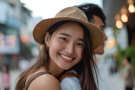 toothy smiling face of asian younger man and woman in city life location