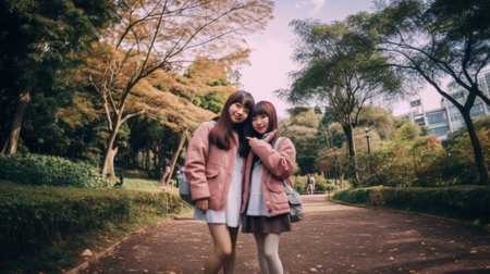 Asian tourists in warm clothes on city street image, ai generated. Positive korean friends group enjoying travelling photography scene wallpaper. Active lifestyle concept photorealistic photo
