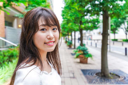 Portrait of young asian woman walking in a city street.