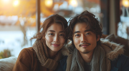 A young Asian couple sitting together, the man gently touching his fiancae's hand, both smiling and sharing a quiet, happy moment