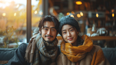 Two individuals seated on a sofa, both dressed in cozy sweaters.