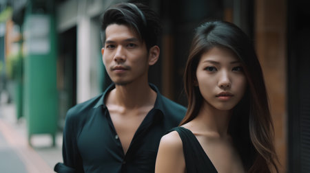 Cool asian couple standing in the city and looking at their phone.