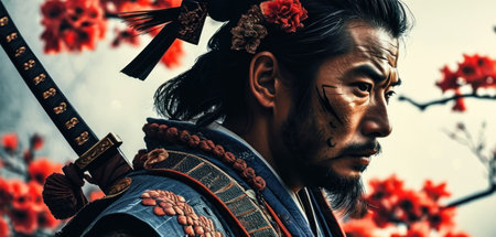 Portrait of a Japanese samurai in traditional costume with red flowers.