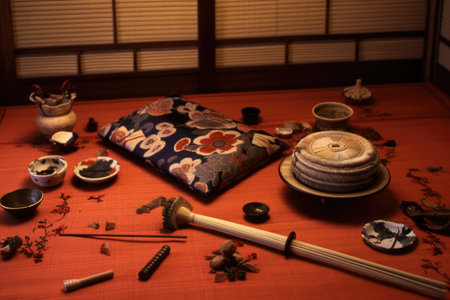 tea ceremony utensils displayed on a tatami mat, created with generative ai