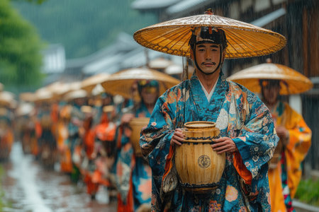 Japanese man holding a barrel wearing traditional clothes walking in the rain with other people during a traditional japanese celebration