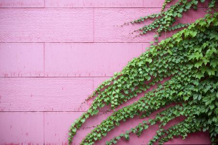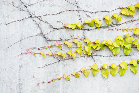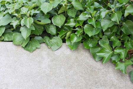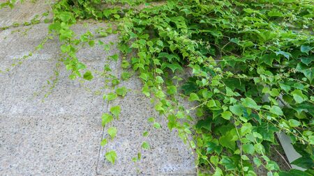 Lush curly ivy throughout the year. Leaves along the wall side, background wall, cement. Copy space. Ivy gourd .