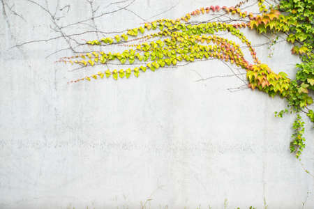 Photo texture of concrete light gray wall with green and red ivy plant.