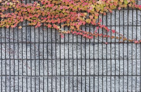 Closeup of twisting ivy stalks with green and red leaves,curling on stone wall