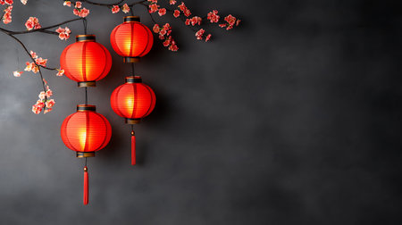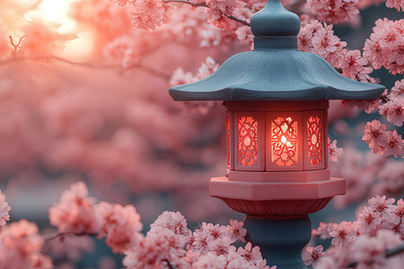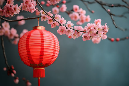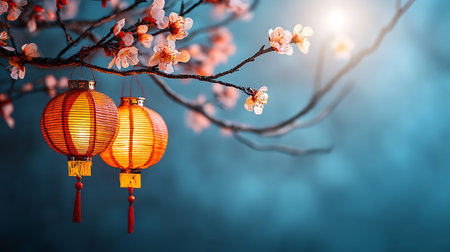 Beautiful red lanterns hang gracefully from a branch adorned with delicate cherry blossoms, creating a tranquil and festive atmosphere in a serene setting.