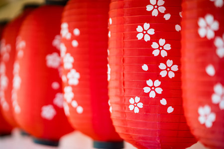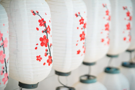 Row of traditional white paper lanterns decorated with red cherry blossom designs creating a festive and cultural atmosphere