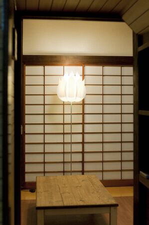 Lantern in Japanese garden at night. Beautiful landscape of Japanese garden.