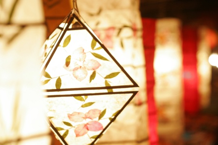 Japanese lantern under the cherry tree (translate text on the lantern reads Good Luck)
