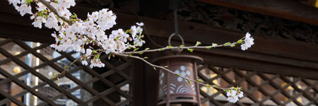 Sakura and hanging metal lantern at wooden Shinto shrine temple in background in Japan