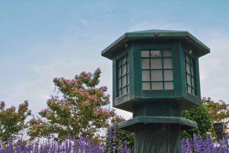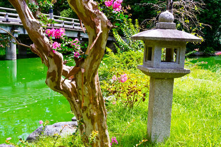 Stone lantern in Japanese garden with blooming flowers, Park Clingendael, The Hague, Netherlands
