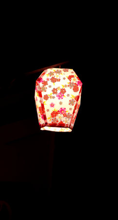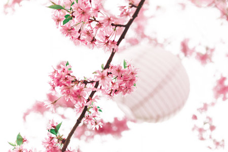 Colorful paper lantern hiding within Japanese cherry blossoms