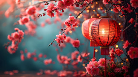 Red lanterns illuminate a scene of delicate pink peach blossoms during the joyous Chinese New Year celebration.