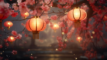 Glowing lanterns hang among blossoming cherry trees. A magical scene.