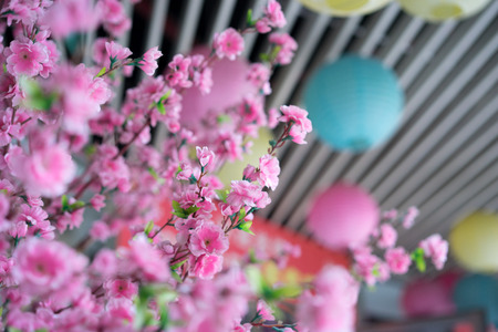Colorful Japanese paper lanterns are installed at the cherry blossom festival in the garden.