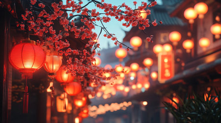Chinese lanterns and cherry blossoms in the old town of Chengdu, China