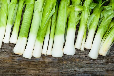 Fresh leeks, green vegetables, farm fresh produce on wooden rustic table, top view