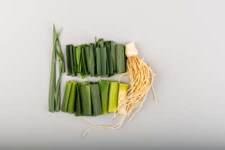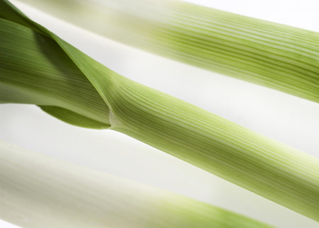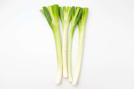 Organic Leek onion Stalks on white background, side view, selective focus space for text