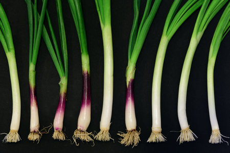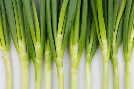 Close up detail of Green onions , a characteristic gradient, transitioning from a crisp white base, through pale yellow-green, to a deep, vibrant green at their leafy tops