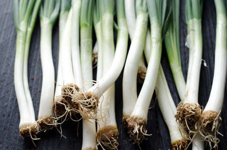 Fresh spring onions on a wooden background. Shallow depth of field.