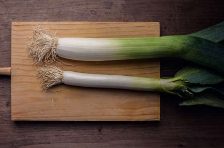 Leek isolated on wood background close up, top view, vegetable food concept.