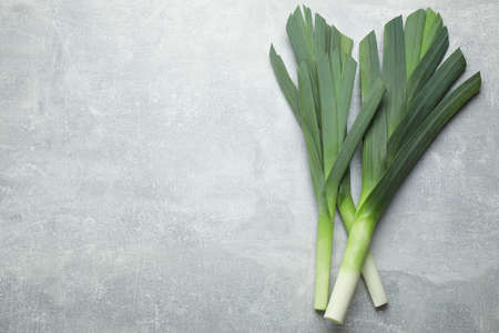 Bunch of Fresh Organic Leeks With Copy Space Green Background Defocused Image