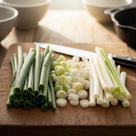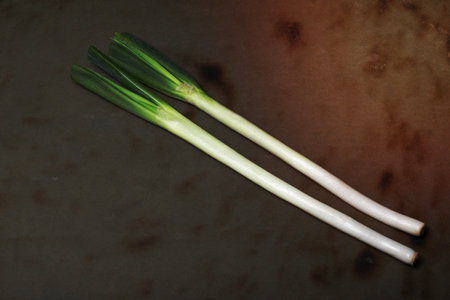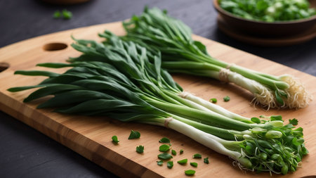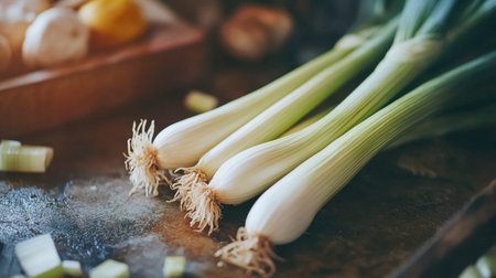 Bright and fresh scallions are arranged on a rustic kitchen countertop. Perfect for adding flavor and nutrition to various dishes and recipes.