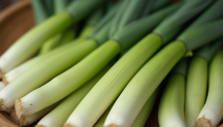 A close-up of fresh green leeks arranged together, showcasing their crisp texture and vibrant green color.