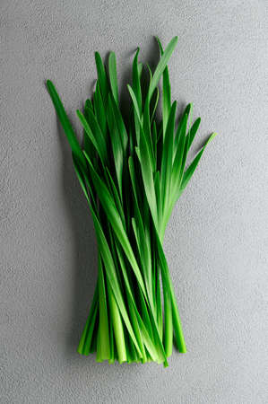 Green onions on a dark gray concrete background. Allium nutans onion. Top view, vertical orientation.